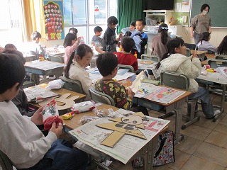 2組と3組は、生活科で「クリスマスリース」を作っていました。自分たちで集めた材料を上手に使っていました。