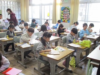 3年1組は、国語で書いた作文を友達と読み合っていました。