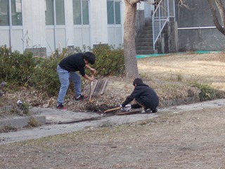 普段使用している教室のワックスがけや、窓の桟の掃除、側溝の掃除等を行いました。6年間通った学校をきれいにしていました。