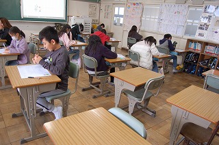 1年3組は算数で、「100までのかずのけいさん」のテストをしていました。