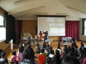 実験コーナーは,液化天然ガスに近い温度をもつ,「液体窒素」を使って,冷たい世界のふしぎを体験しました。 | |