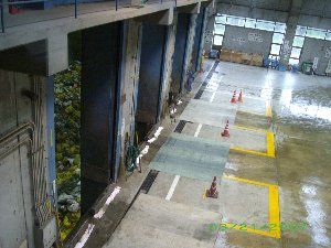 パッカー車が入り,ごみピットにごみを入れる場所です。左のほうにごみピットが見えます。深さ10m。いっぱいたまると,さすがに1日では燃やしきれないということでした。 |