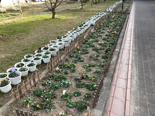 花壇のビオラ、パンジーも元気に咲いています。