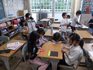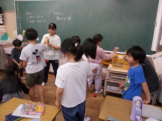 2年3組では、教育実習生と一緒にお手玉やけん玉をしていました。