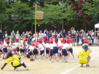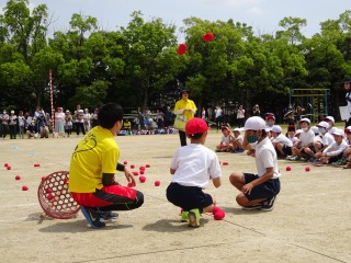 1・2年生の玉入れです。カゴめがけて一生懸命投げています。