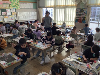 3組は図工でした。絵の具を手指を使って画用紙に塗り、作品を創っていました。