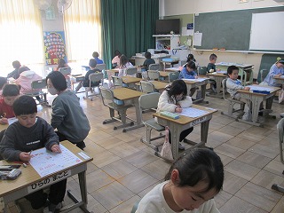 1年3組は算数で、「100までのかずのけいさん」のテストをしていました。
