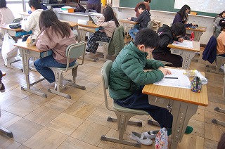 1年3組は算数で、「100までのかずのけいさん」のテストをしていました。